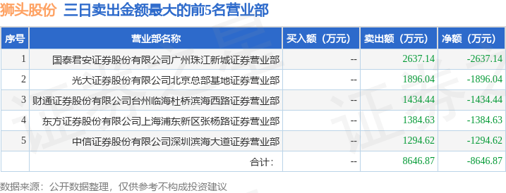 证券之星消息,沪深交易所2025年1月22日公布的交易公开信息显示,狮头股份(600539)因非ST、*ST和S证券连续三个交易日内收盘价格跌幅偏离值累计达到20%的证券登上龙虎榜。此次是近5个交易日内第3次上榜。